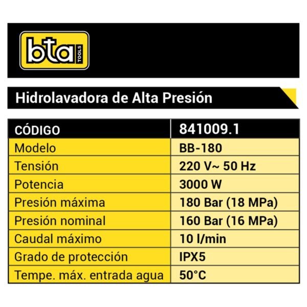 La hidrolavadora industrial BB-180 de BTA Tools está diseñada para brindar máxima eficiencia en tareas de limpieza intensiva. Con un motor a inducción de 3000 W, pistones cerámicos y tapa de cilindros de bronce, ofrece una presión de hasta 180 Bar y un caudal constante de 10 litros por minuto, lo que la convierte en una herramienta ideal para lavaderos de autos y camionetas, flotas de transporte, maquinaria agrícola o vial, equipos de construcción y superficies industriales.