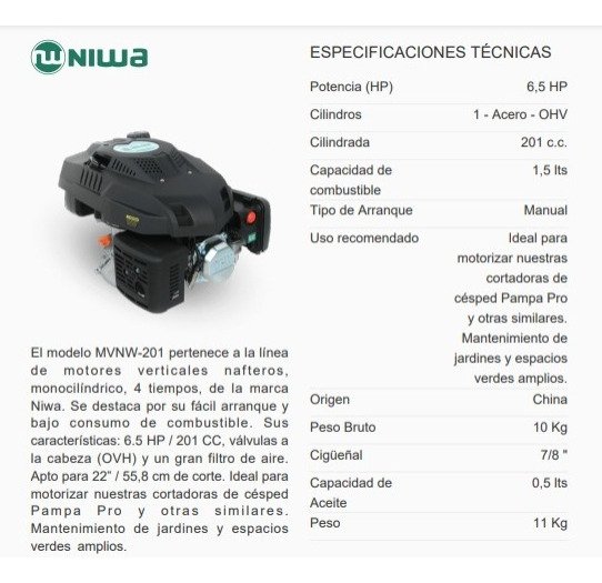 El modelo MVNW-200 pertenece a la línea de motores verticales nafteros, monocilíndrico, 4 tiempos, de la marca Niwa. Se destaca por su fácil arranque y bajo consumo de combustible. Sus características: 6.5 HP / 200 CC, válvulas a la cabeza (OVH) y un gran filtro de aire. Apto para 22” / 55,8 cm de corte. Ideal para motorizar nuestras cortadoras de césped Pampa Pro y otras similares. Mantenimiento de jardines y espacios verdes amplios.